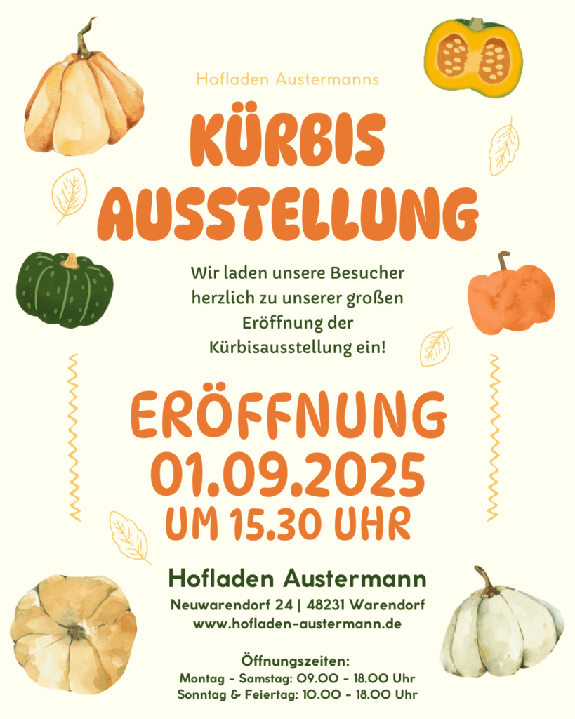 Am 01.09.2025 werden wir unsere diesjährige Kürbisausstellung auf dem Hof um 15.30 Uhr eröffnen. Ihr könnt euch nicht vorstellen wie sehr wir uns jedes Jahr auf diese Ausstellung freuen 🌞🍁🍂 Die Ernte der 60 verschiedenen Kürbissorten und der Aufbau der Ausstellung dauert eine ganze Woche und tatsächlich werden alle Kürbisse der großen Skulptur per Hand in das Gerüst gebunden.