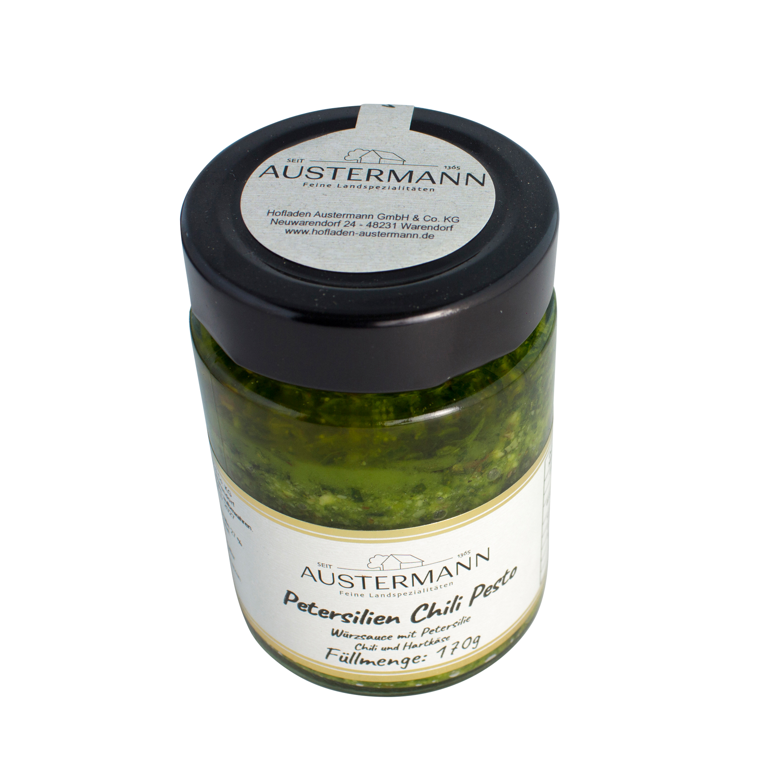 Das Petersilien Chili Pesto ist seit Juli 2025 neu in unserem Sortiment und wurde von unserem Küchenchef Fabian Reth entwickelt. Die von uns selbst angebaute Petersilie sorgt für eine unglaubliche Frische. Die milde Schärfe der Chilis harmonisiert perfekt dazu und wirkt belebend. Ein wunderbares, außergewöhnliches Pesto, das jedes noch so einfache Gericht zum Festmahl werden lässt.