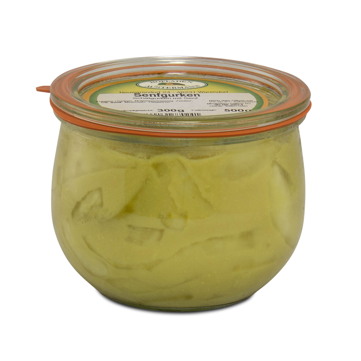 Gurken, Branntweinessig, Zucker, 5 % Senf, Meersalz, Gewürze