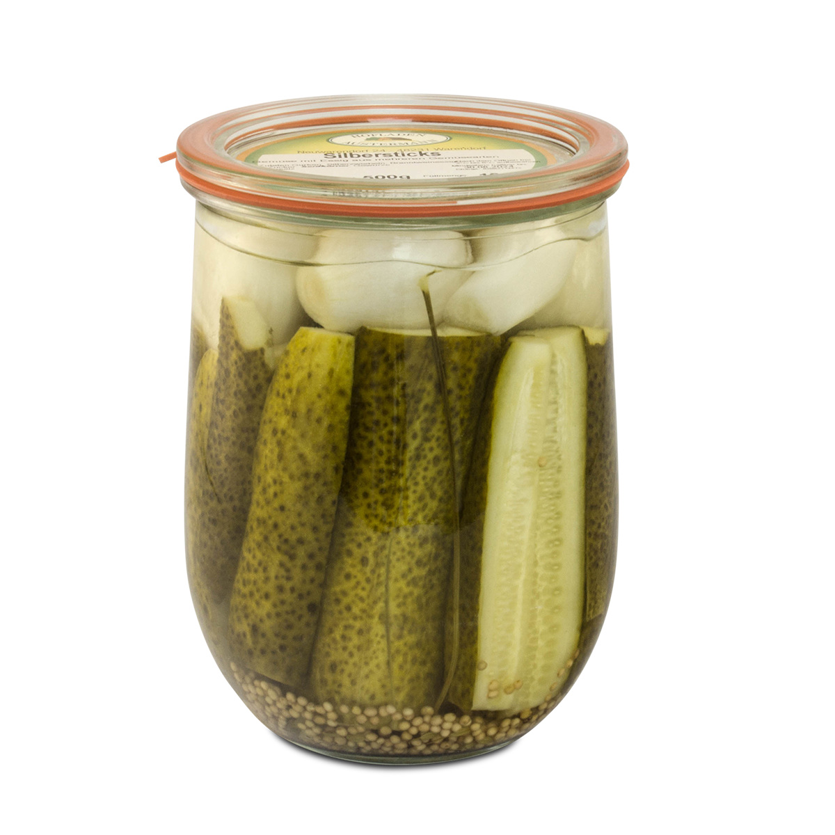 Gurken, Silberzwiebeln, Branntweinessig, Zucker, Senfkörner, Gewürze, Meersalz