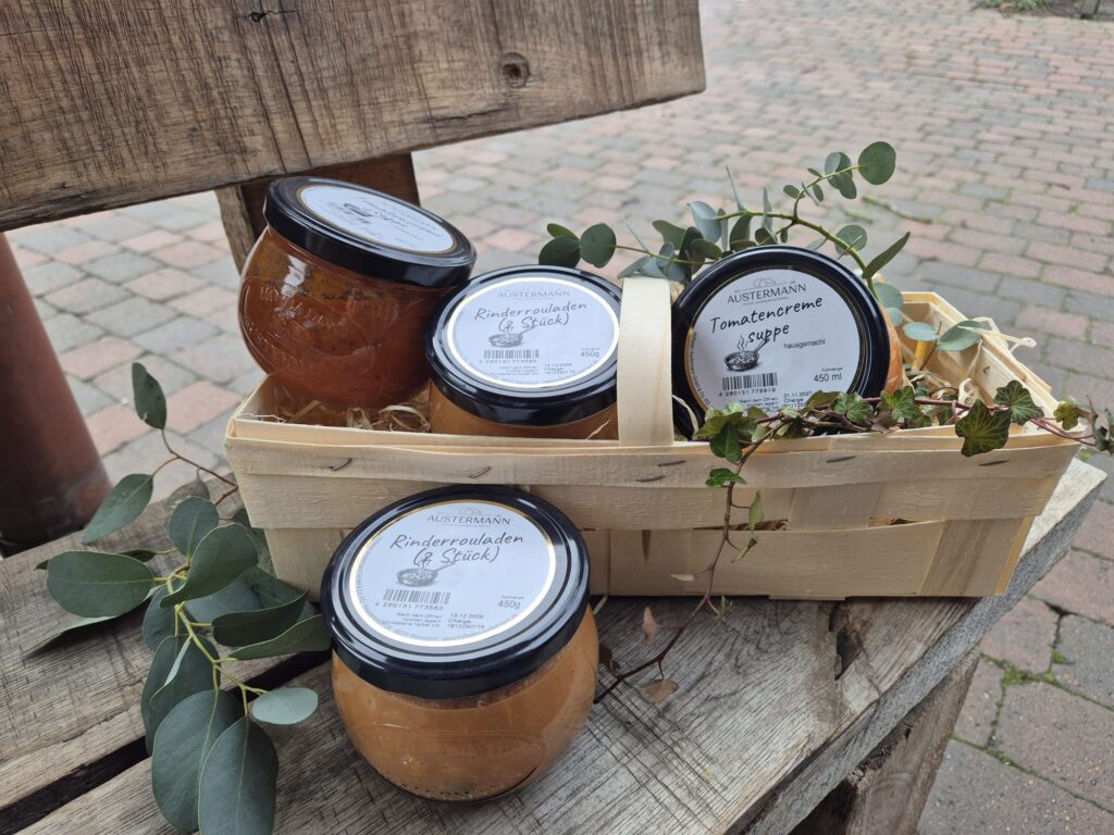 Ab sofort füllen wir unsere knapp 30 verschiedenen Fertiggerichte, die wir in unserer Hofküche produzieren, in unsere selbst entwickelten Gläser. Die Füllmenge und der Geschmack der Gerichte bleiben dadurch unverändert. Unsere Gläser sind ein Best-Of der aktuellen Gläser. Sie sind bauchig wie die Tulpengläser von Weck, tragen unser Hofladen-Logo, haben einen schlichten schwarzen Schraubdeckel und unser neues Etiketten-Design. Nach dem Gebrauch können sie dem Recycling zugeführt werden, so dass neues Glas draus entstehen kann. Natürlich lassen die Gläser sich durch den Schraubdeckel auch gut für andere Dinge als Aufbewahrung nutzen. Alle anderen Produkte werden weiterhin in ihren bisherigen Gläsern produziert.